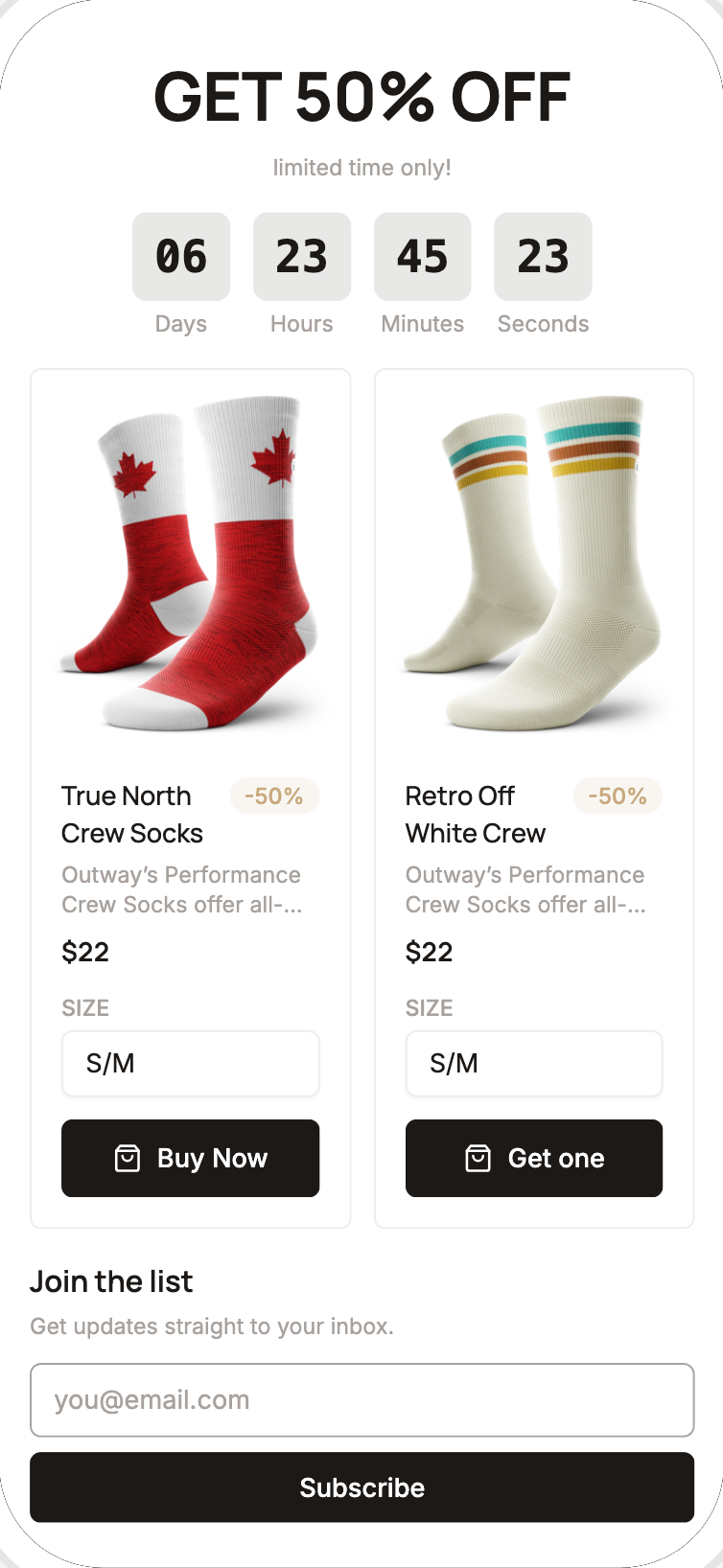 Collectez des emails avec un formulaire intégré. Offrez un code promo en échange. Les nouveaux abonnés se synchronisent automatiquement vers Mailchimp, sans export manuel.